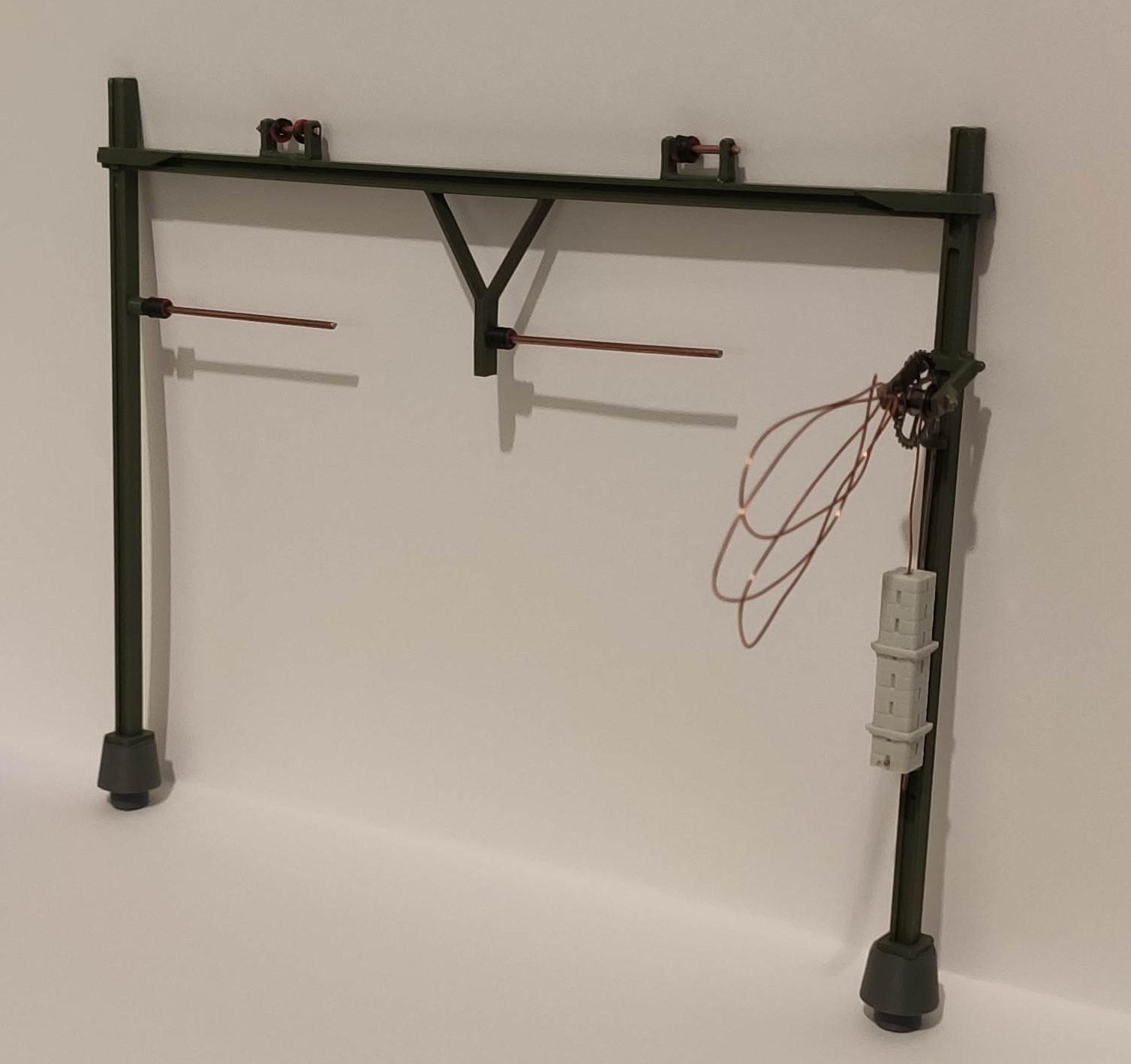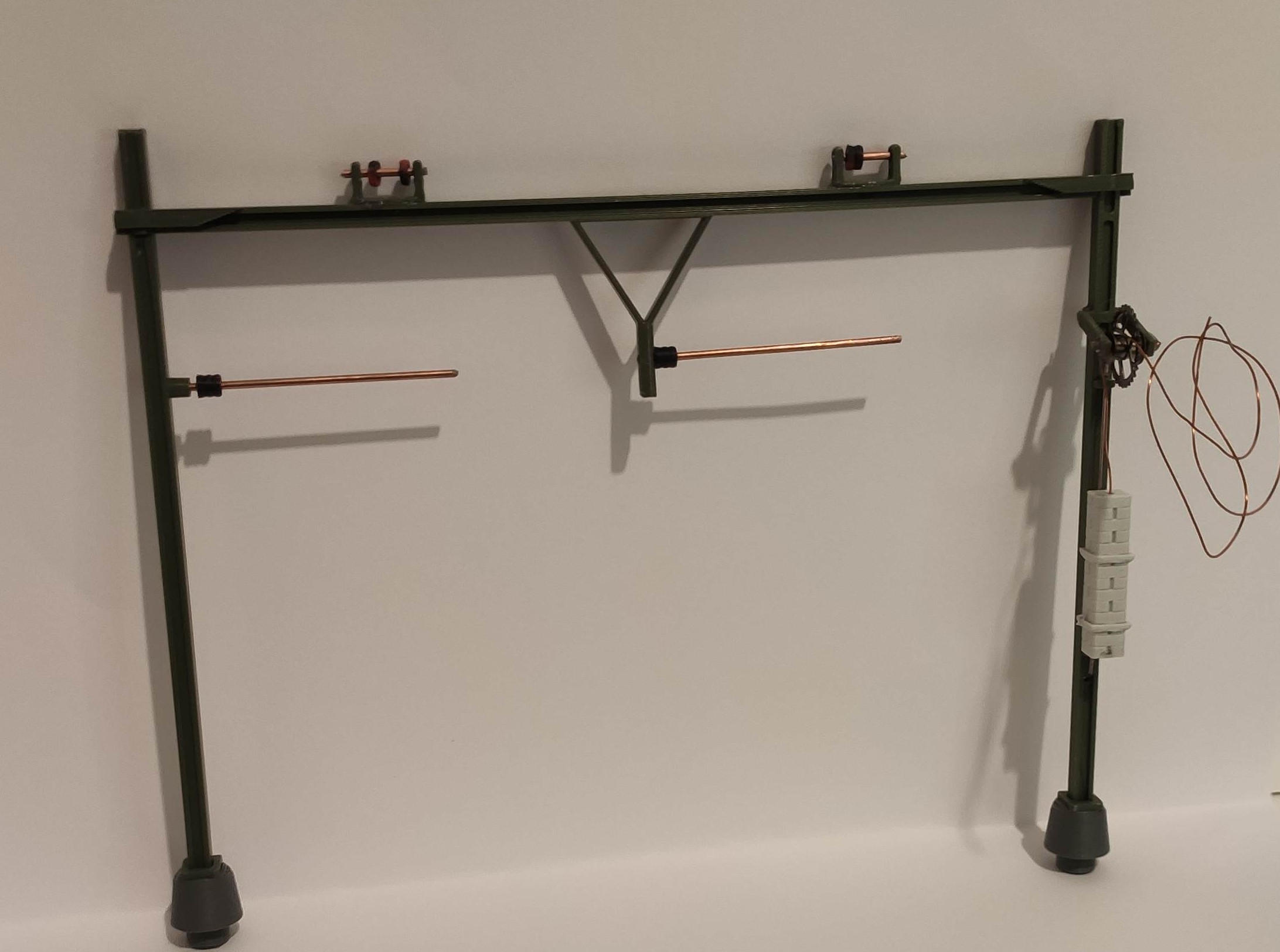 Bovenleidingportaal dubbel spoor schaal HO met rijdraad span inrichting met inwendig veer.