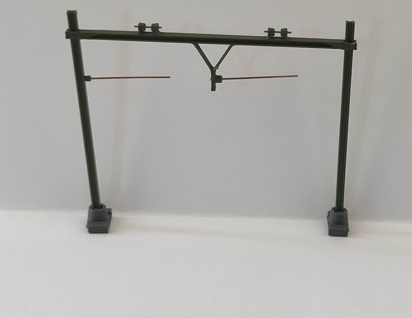 Dubbel spoor portaal schaal N functioneel met verkoperde rijdraad begeleiders